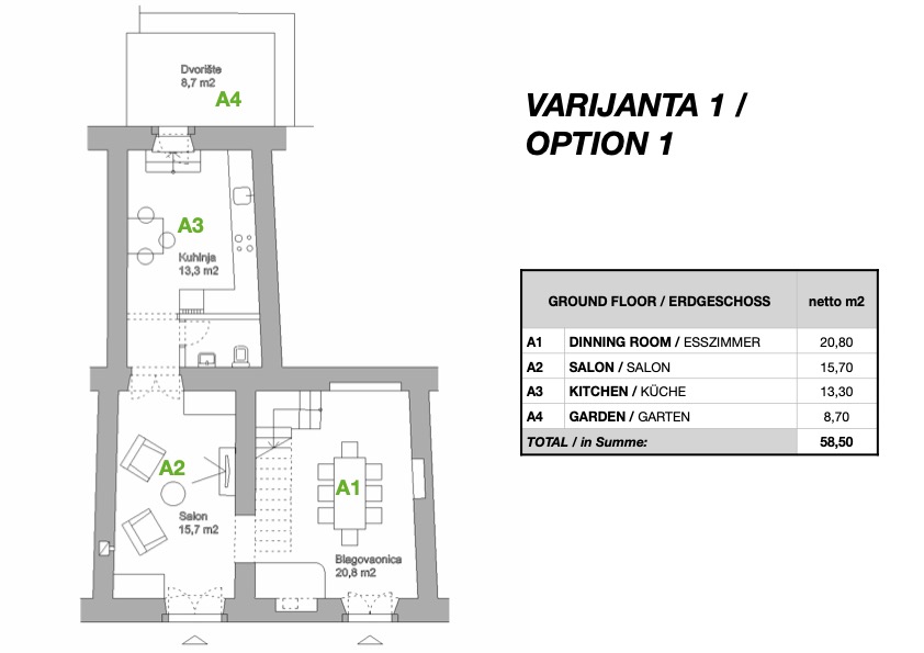 The characteristic smell of stone in summer evenings is not the only thing that sets this property apart from others. The nearby garden of about 600 m2 is an inviting place for additional relaxation and contact with nature. With so much space, you can unleash your creativity and, for example, build a summer kitchen with a swimming pool.