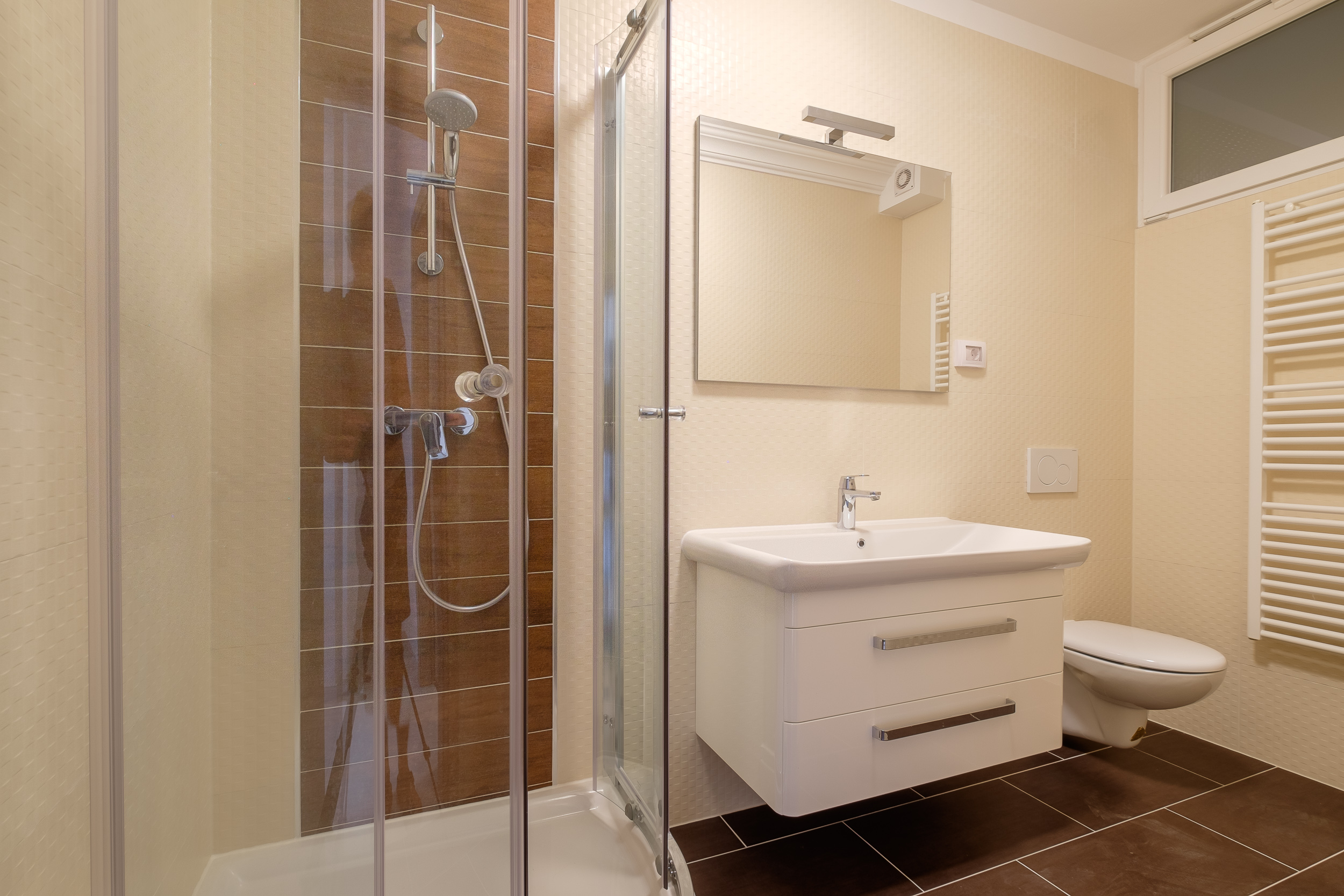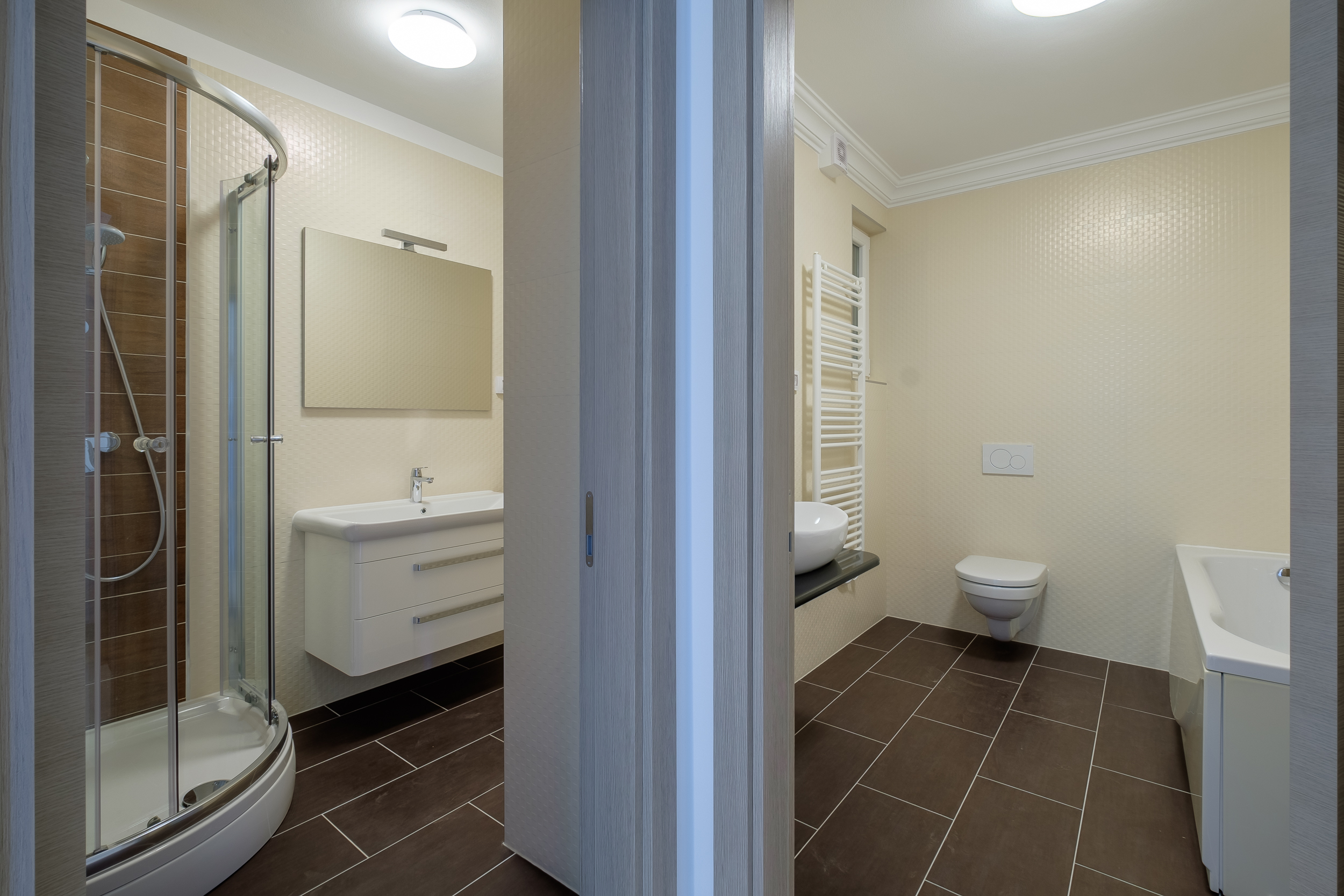 It consists of a living room, kitchen and dining room with access to a 12 m2 glazed balcony. This spacious balcony can easily become your oasis to spend sunny mornings with coffee or a pleasant summer evening with a refreshing drink. The apartment has two bedrooms, two bathrooms, one with shower, the other with a bath. In front of the building, there is a parking lot, which has one parking space.
