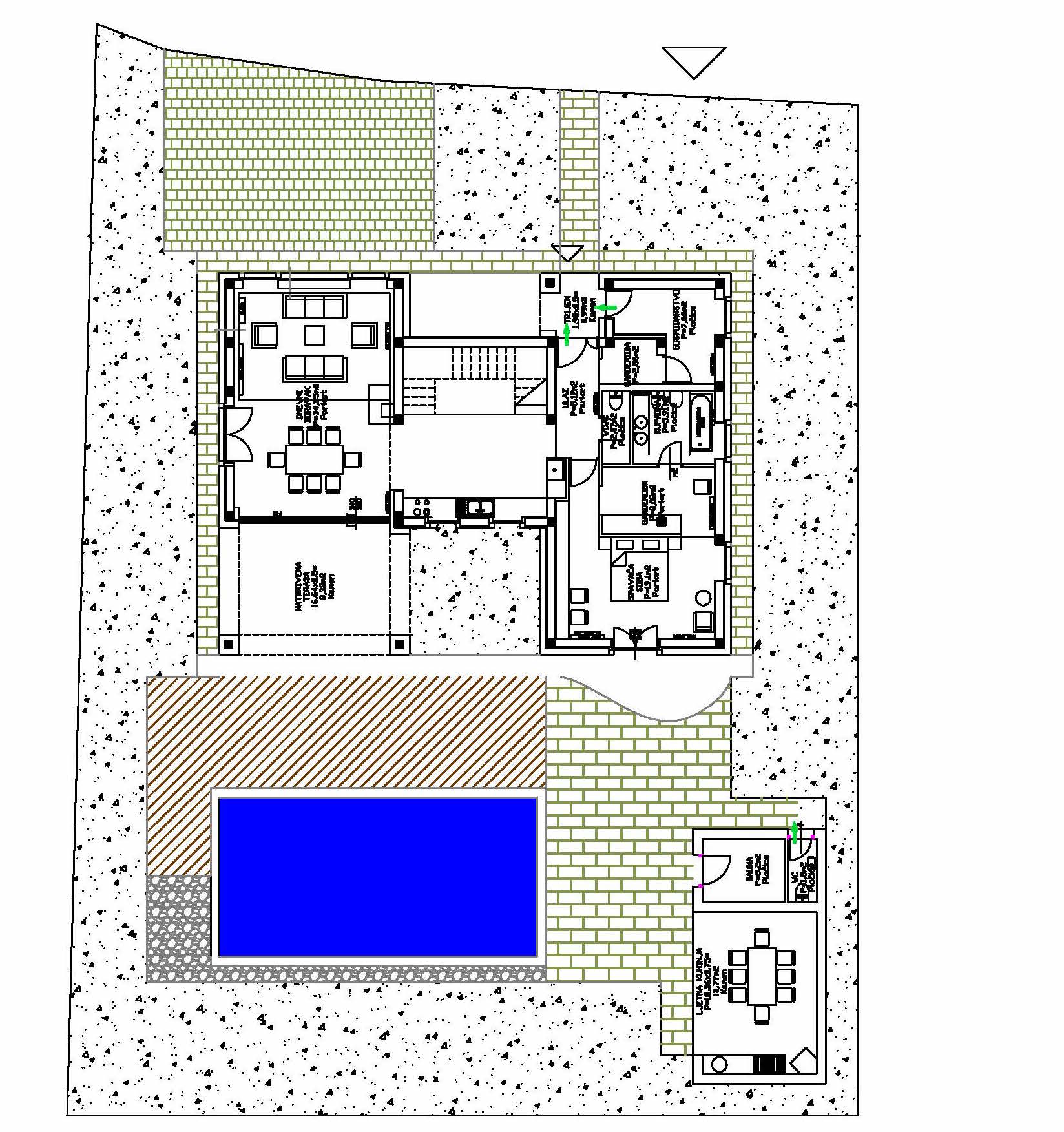 Uz bazen se nalazi pomoćni objekt gdje je predviđena sauna, toaletom, te velika vanjska kuhinja s kaminom za grill i natkrivena terasa. Kompletno zelenilo i bilje u vrtu snadbijevano je s automatskim navodnjavanjem.